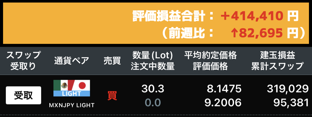 | 今週 4/10 | 303,000 | 8.1475 | 9.2006 | +1.0531 | +319,029 | 95,381 | +414,410 |